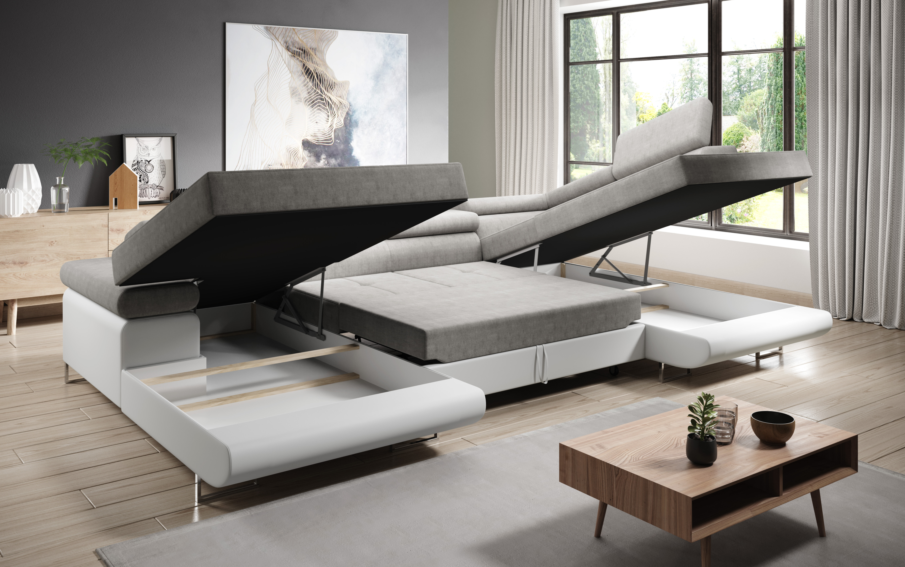 Sedačka má pevná záda se sklopným záhlavníkem a 2 úložné prostory.