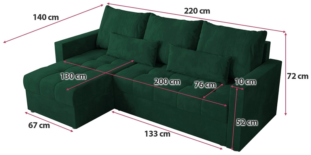 Součástí jsou 3 velké a 2 menší polštáře a úložný prostor. Celočalouněná, vhodná do prostoru. Sedačka má prošívaný sedák. Obrázek s rozměry je ilustrativní - je to jiná barva.