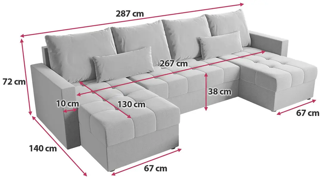 Rozkládací rohová sedačka ve tvaru U Sedačka je univerzální. Součástí jsou 4 velké a 2 menší polštáře a úložný prostor. Celočalouněná, vhodná do prostoru. Sedačka má prošívaný sedák.Obrázek s rozměry