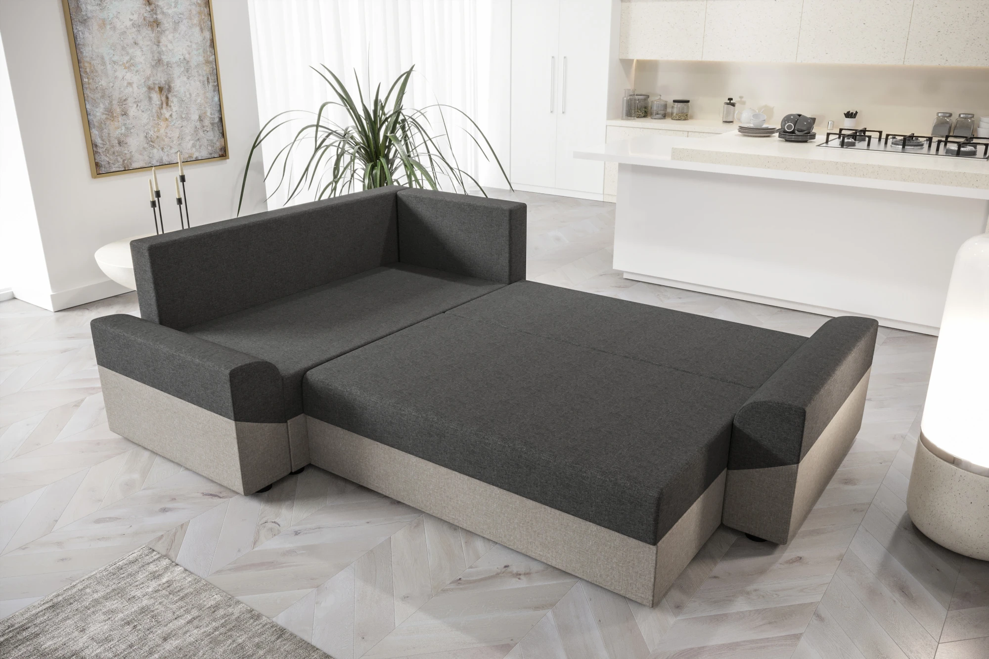 Rozkládací rohová sedačka, levá Potahová látka: sawana 21 = světle šedá látka/sawana 01 = krémová látka Součástí je 6 zadních polštářů se zipem, sada dekoračních polštářů v rozměrech 40x40 cm a 1 úložný