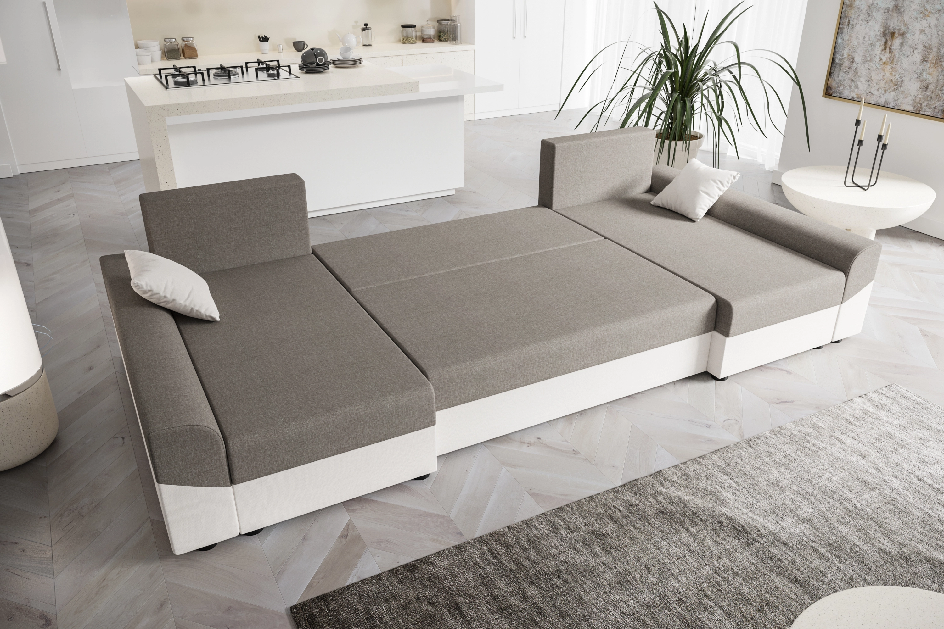 Součástí jsou 4 zadní polštáře se zipem, sada dekoračních polštářů v rozměrech 40x40 cm a 1 úložný prostor.