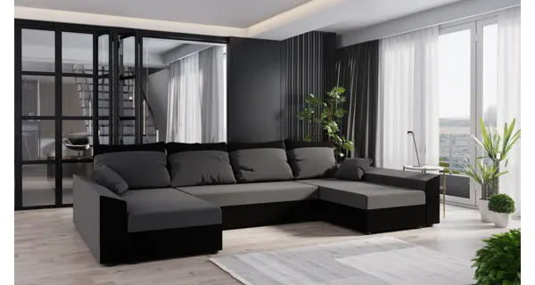 Rozkládací rohová sedačka ve tvaru U Potahová látka: rainbow 27 = šedá látka/rainbow 15 = černá látka Součástí jsou 4 zadní polštáře se zipem, dekorační polštáře v rozměrech 40 x 40 cm a 1 úložný prostor. Obrázek