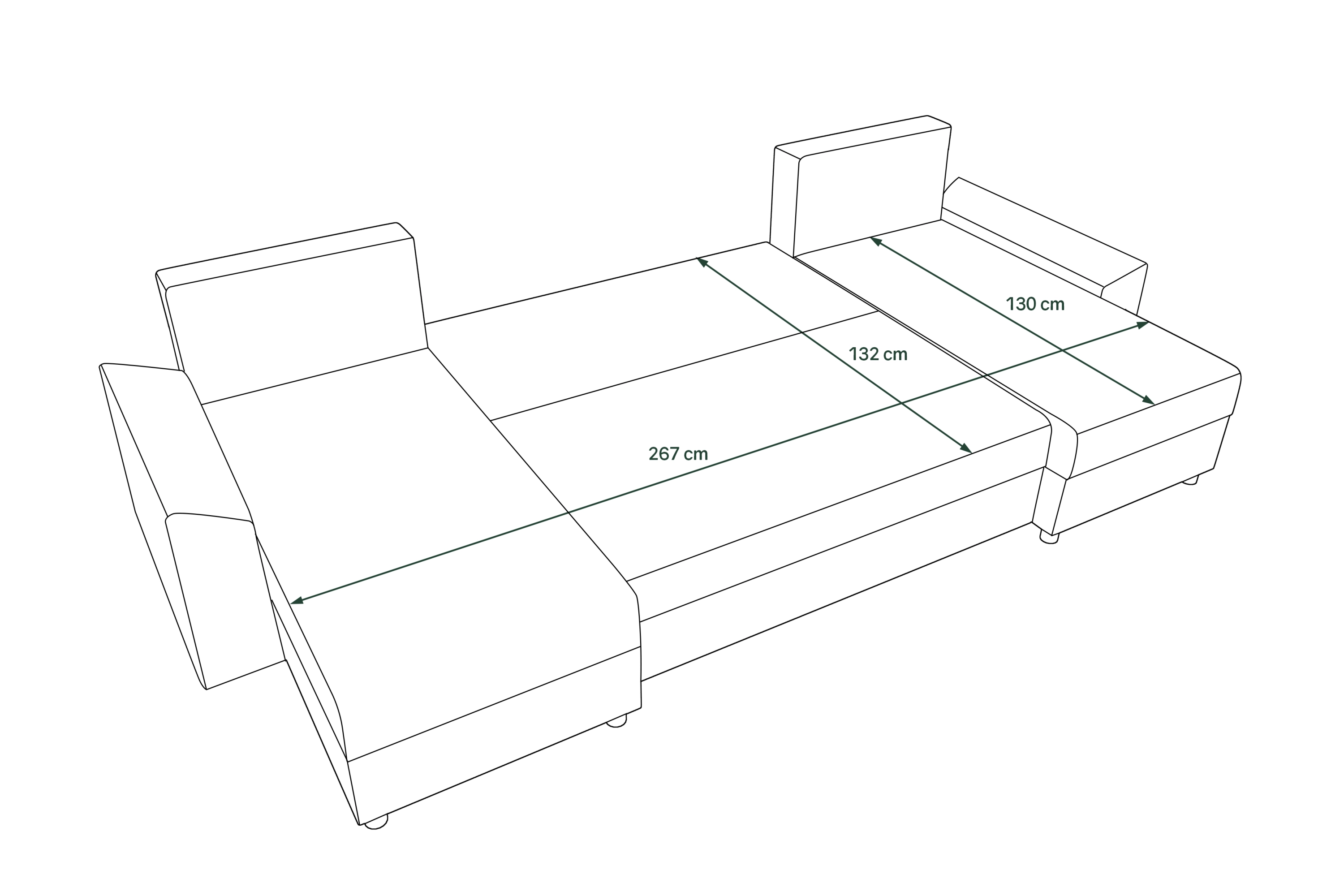 Ložná plocha (šxh): 267 x 132 cm Výška sedu: 37 cm Hloubka sedu: 70 cm (bez polštářů) Šířka područek: 19 cm