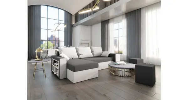Rozkládací rohová sedačka s knihovnou a 2 taburetySedačka je univerzální = roh lze smontovat na pravý i levý! Potahová látka: mikrofáze 27 = tmavě šedá látka/mikrofáze 31 = bílá látka (PES 100%, 230 g/bm Celočalouněná