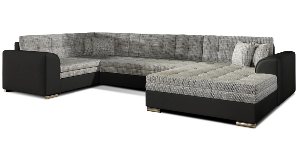 Rozkládací rohová sedačka ve tvaru "U" Provedení: pravé Potahová látka: Berlin 01 = šedá látka prošitá béžovou a černou nití/Soft 11 = černá ekokůže Obrázky rozložené sedačky a detailů jsou pouze ilustrativní (jiná barva)! Materiál: vlnité pružiny, nožky - chrom Rozměry (dxšxv): 340 x 167/190 x 80 cm Výška a hloubka sedu: 38 x 59 cm Prostor pro spaní: 275 x 126 cm Systém rozkladu "Delfin" Dodání v demontu. Záruka 24 měsíců.