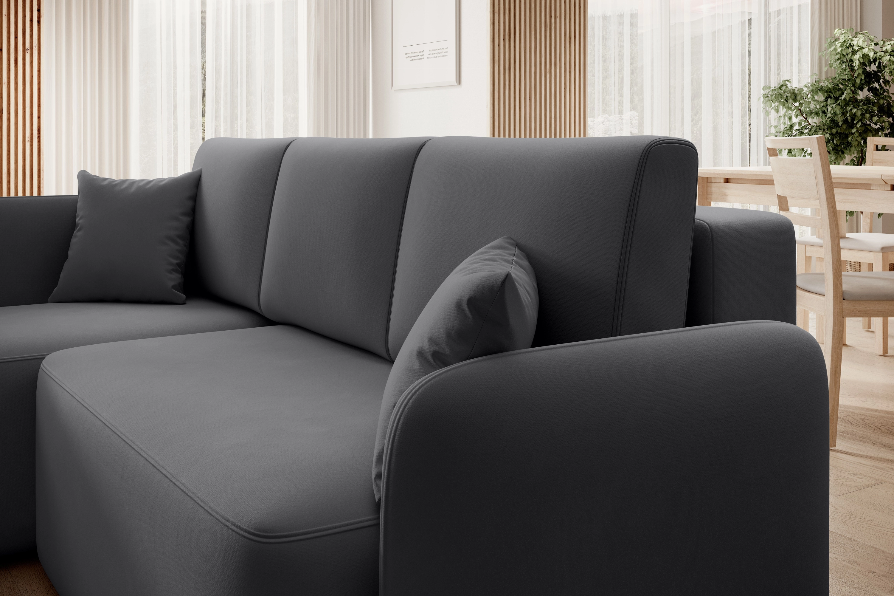 Rozkládací rohová sedačka s úložným prostorem. Provedení: levé Materiál: vlnité pružiny typu B/sezení z pěny HR T3030/záda z pěny T2540/T2130 - nožky jsou z plastu Barva: tmavě šedá látka Sola 6 Rozměry (šxvxh): 206 x 89 x 150 cm - výška sedačky bez polštářů: 77 cm - hloubka sedu: 49 cm - výška sedu: 47 cm - výška opěradla: 42 cm - výška nožek: 2,5 cm - prostor po rozložení na spaní: 115 x 184 cm Mechanismus rozkladu DL. Pohovka má čalouněná záda, je ji tedy možno umístit do prostoru. Nosnost je 270 kg. Fotografie detailů sedačky a jejího rozkladu jsou pouze ilustrační, jedná se o opačné provedení! Dodáváno v demontu.
