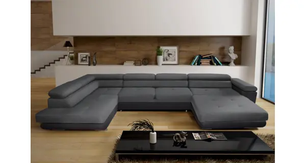 Rozkládací rohová sedačka ve tvaru U, levá Potahová látka: sawana 21 = světle šedá látka/sawana 05 = tmavě šedá látka Součástí jsou 4 regulovatelné záhlavníky, rozklad - výsuvná matrace (delfin) a 2 úložné