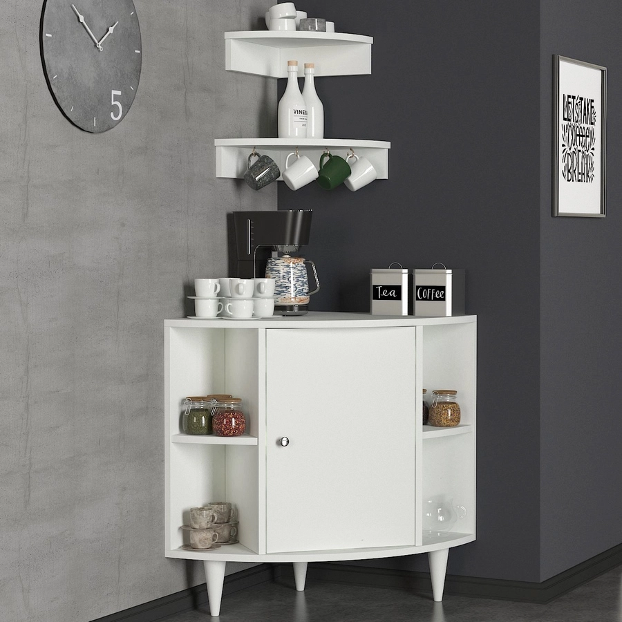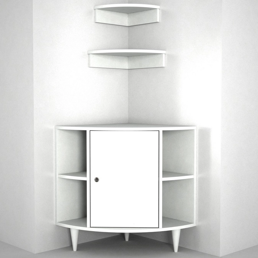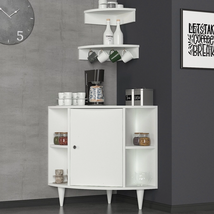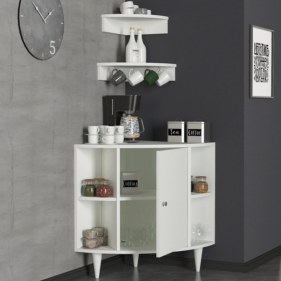 Rohová skříňka s policemi je vyrobena z kvalitního lamina o tl.18 mm hraněné PVC páskou, odolného proti poškrábání v barvě matná bílá.