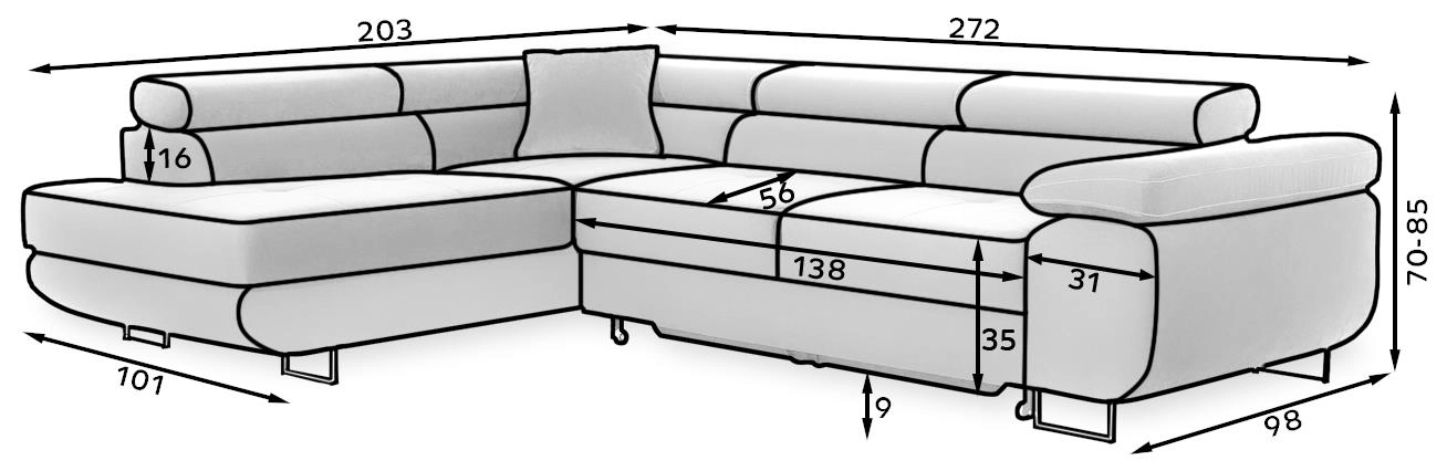 Rozkládací rohová sedačka ve tvaru "L" Levé provedení Zadní část sedačky je potažená látkou, je tedy možné postavit ji kdekoliv v prostoru. Obrázek rozložené sedačky je pouze ilustrativní (jiná barva)! Potahová látka: Sawana 21 = světle šedá látka/Soft 11 = černá ekokůže Materiál: vlnité pružiny, nožky - kov Rozměry (dxšxv): 275 x 202 x 90 cm Výška sedu: 43 cm Prostor pro spaní: 193 x 125 cm Systém rozkladu "Delfin" Sedačka má úložný prostor. Dodání v demontu.