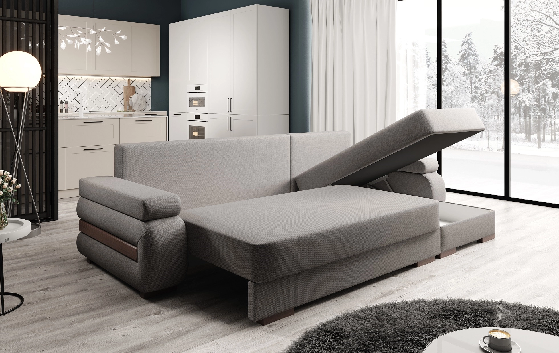 Součástí jsou polštáře se zapínáním na zip a úložný prostor. Celočalouněná, vhodná do prostoru. Sedačka má boky zdobené dřevem.