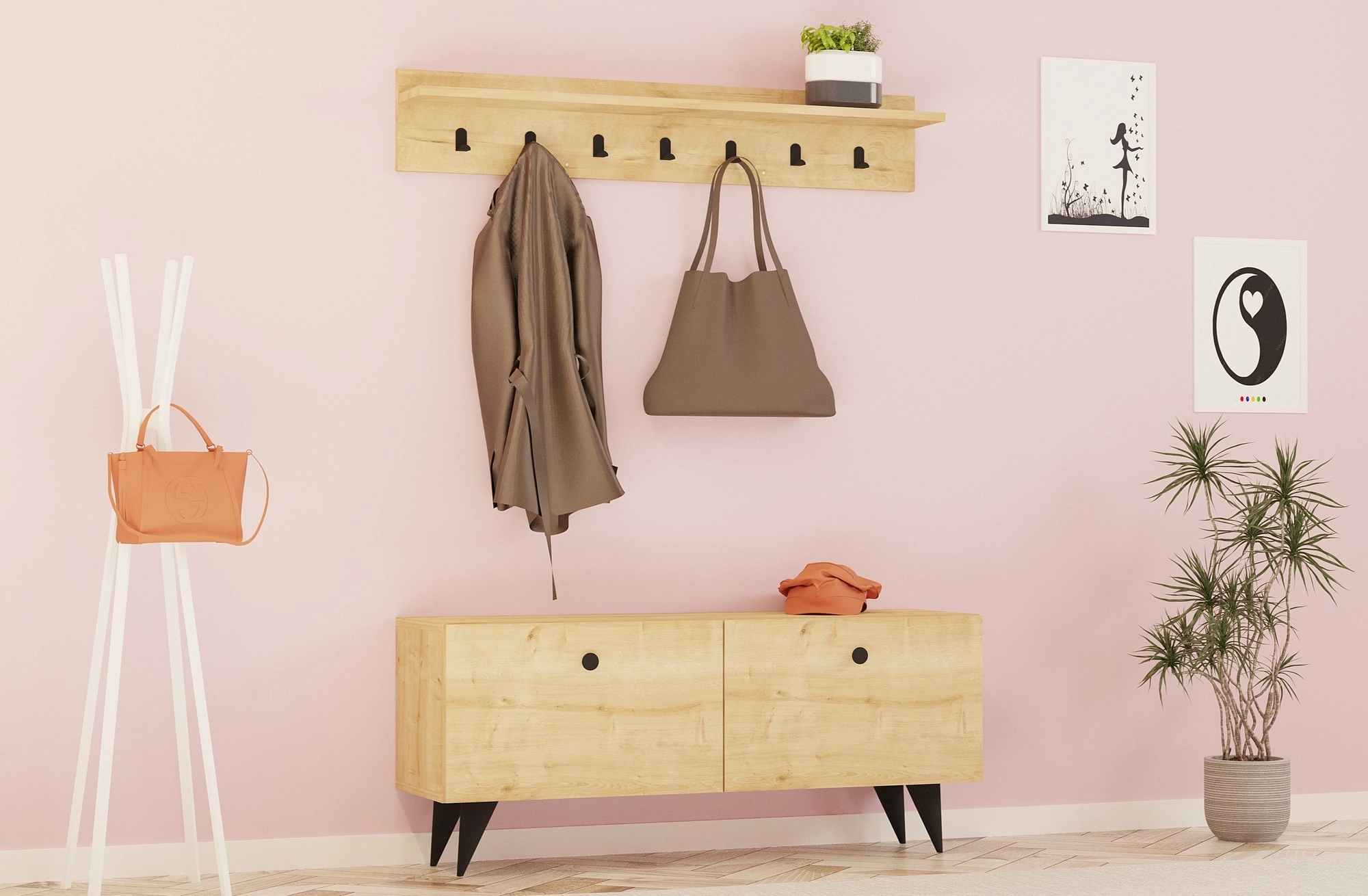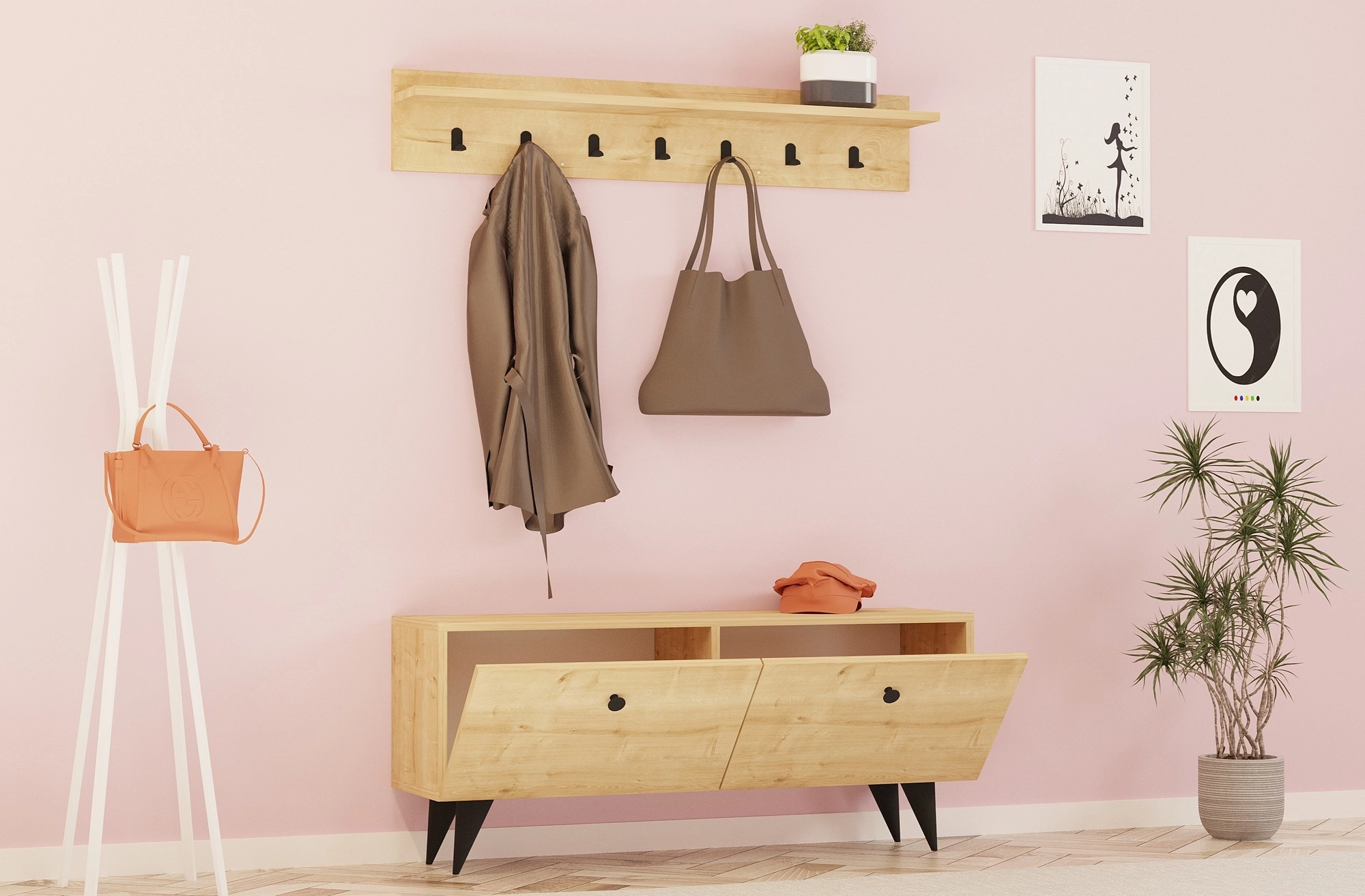 Technické údaje:Typ výrobku: Stojan na dřevo: Stojan do předsíněMateriál: Materiál: 100% melaminovaná dřevotřísková deskaTloušťka: 18 mmVelikost stojanu na halu: Šířka: 113 cm, výška: 48. 5 cm, hloubka:
