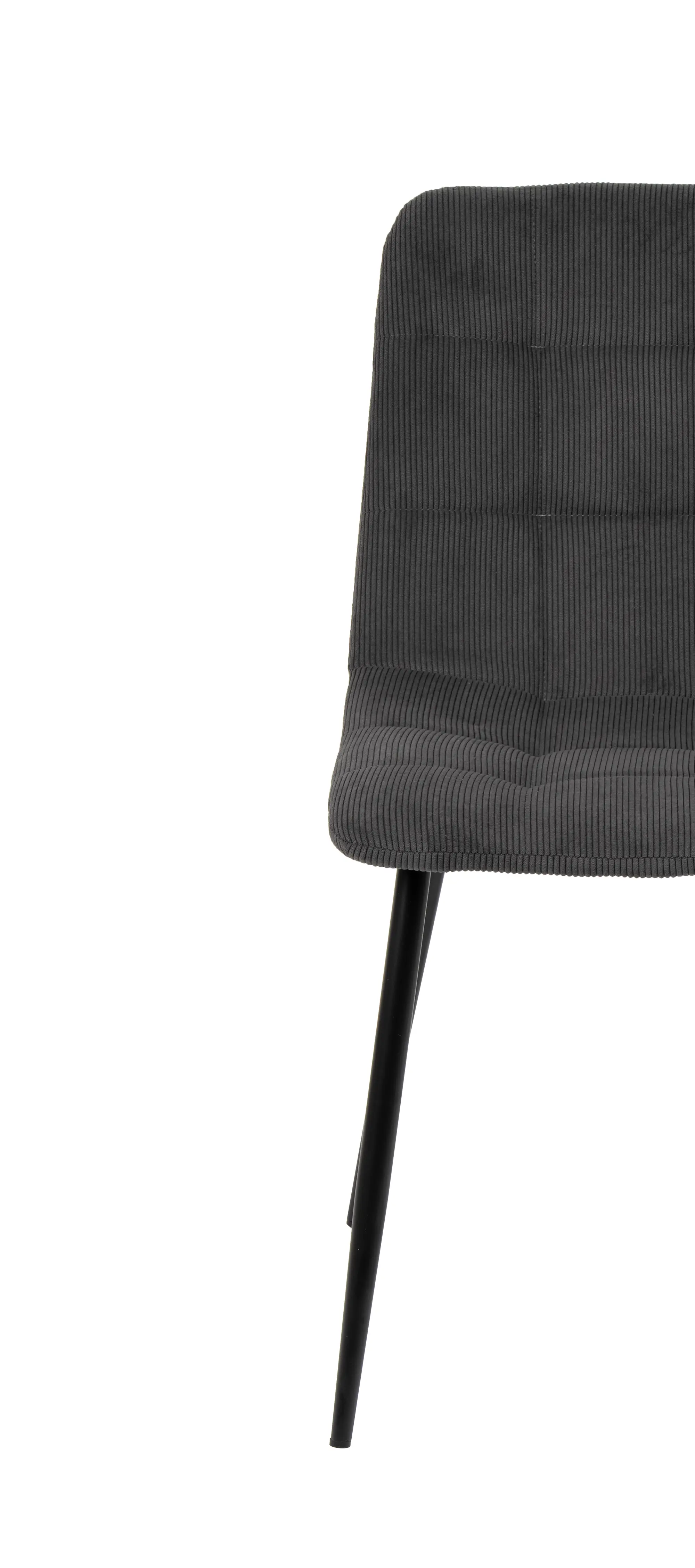 Tato jídelní židle zaujme jednoduchým tvarem a pohodlným čalouněním z tmavě šedého manšestru. Kovové nohy v černé barvě dodávají potřebnou stabilitu a snadno se kombinují s různými typy stolů.