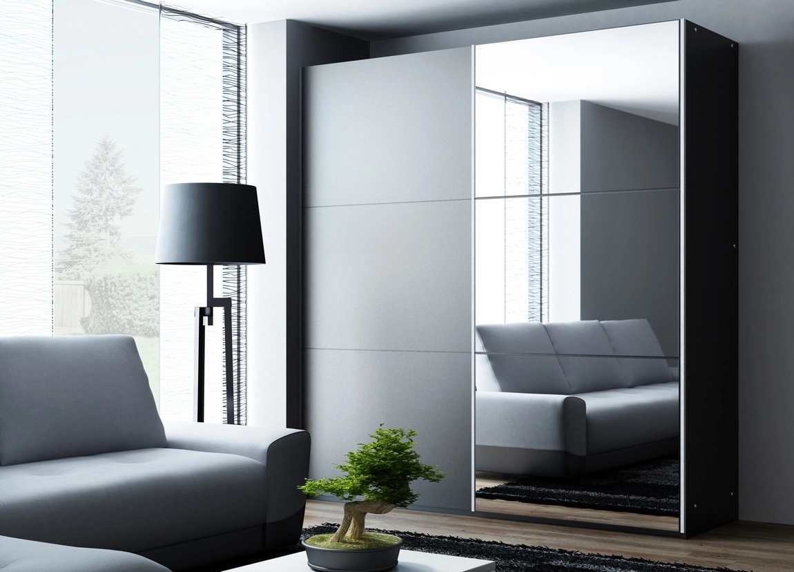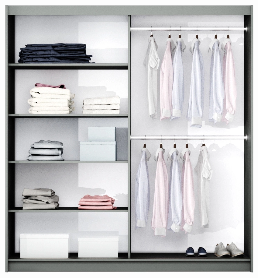 Šatní skříň s posuvnými dveřmi v moderním provedení vhodná do monochromatického interiéru. Korpus i dvířka jsou z kvalitní LTD desky černé barvy. Dveře jsou v barvě černé doplněné zrcadlem. Uspořádání polic viz obrázek.