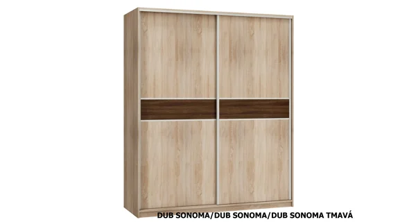 Šatní skříň Vnitřní členění viz další obrázek. Rozměr (šxvxh): 180 x 216 x 65 cm Materiál: LTD 16 mm Barva (korpus/dveře/pruh na dveřích): dub sonoma/dub sonoma/dub sonoma tmavý Dodává se v demontu.
