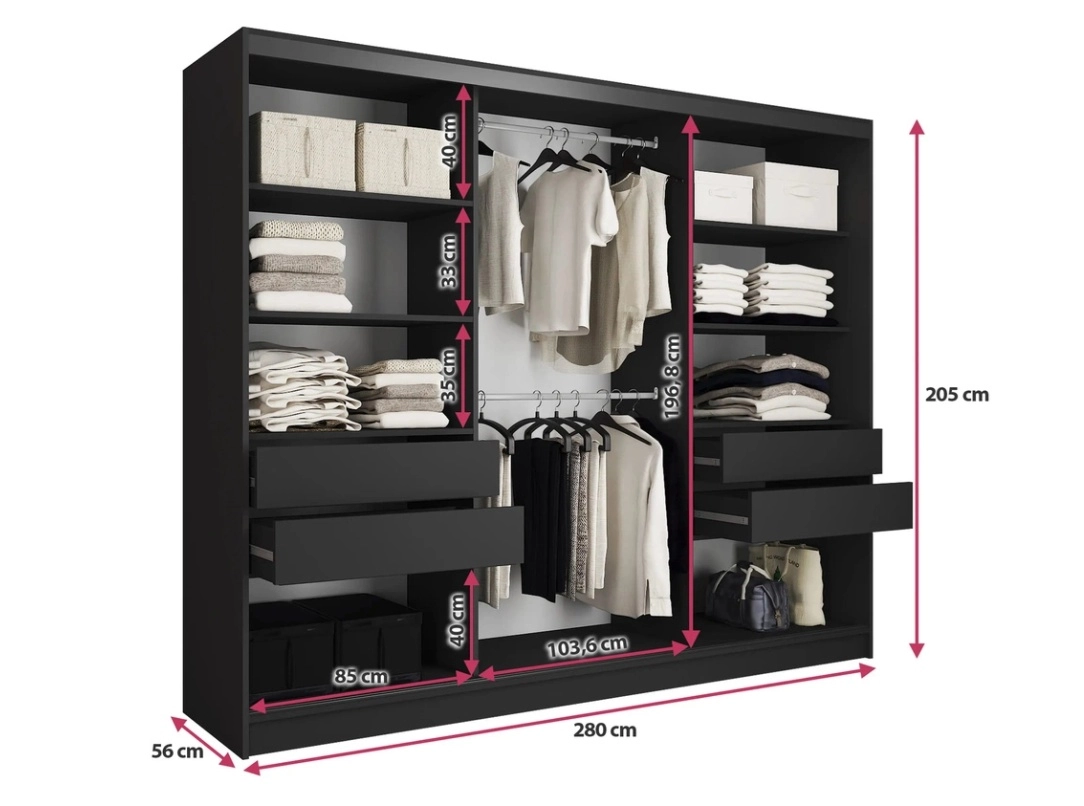Šatní skříň HARAZIA 280 bez zrcadla, se 4 šuplíky a 2 šatními tyčemi, černý mat/ dub lefkas