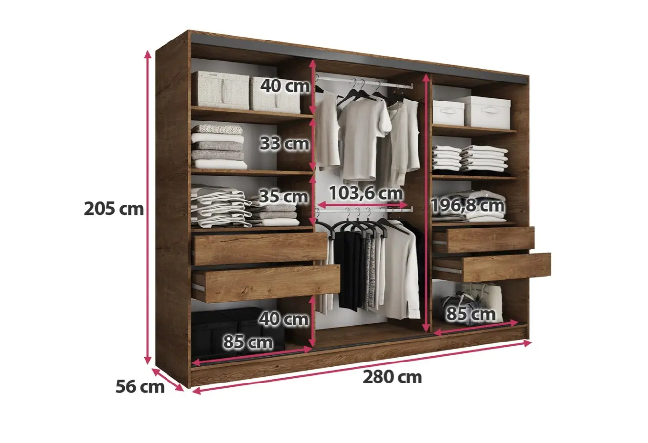 Kombinovaná šatní skříň s posuvnými dveřmi.Ozdobné lišty, které jsou na dveřích skříně, není nutné na dveře instalovat. Můžete tak mít hladké dveře bez lišt.Rozměry (šxvxh): 280 x 205 x 56 cmMateriál:
