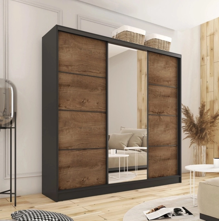 Kombinovaná šatní skříň s posuvnými dveřmi a zrcadlem.Ozdobné lišty, které jsou na dveřích skříně, není nutné na dveře instalovat. Můžete tak mít hladké dveře bez lišt.Rozměry (šxvxh): 200 x 205 x 56 cmMateriál: