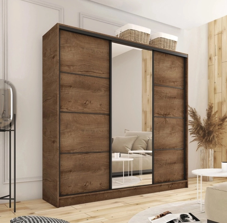 Kombinovaná šatní skříň s posuvnými dveřmi a zrcadlem.Ozdobné lišty, které jsou na dveřích skříně, není nutné na dveře instalovat. Můžete tak mít hladké dveře bez lišt.Rozměry (šxvxh): 180 x 205 x 56 cmMateriál: