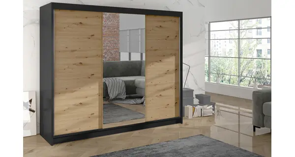 Šatní skříň se zrcadlem Barva: černá/dub artisan Rozměry (šxhxv): 200 x 58 x 215 cm Materiál: - laminovaná deska o tloušťce 16 mm, hrany ABS - hliníkové kolejnice Sevroll - úchyty ve formě hliníkové