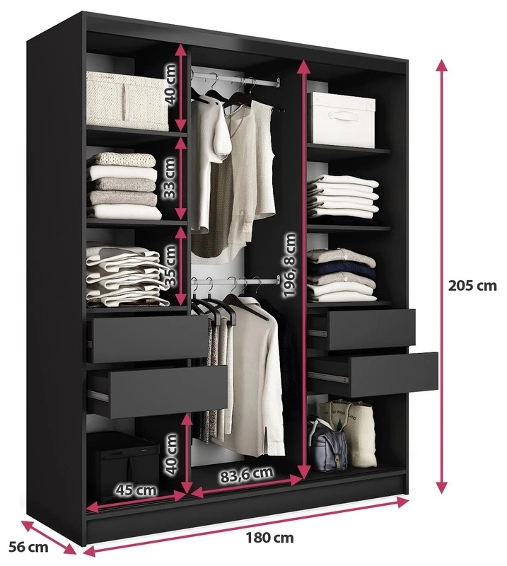 Šatní skříň INSULAR 3D 180 bez zrcadla, se 4 šuplíky a 2 šatními tyčemi, černý mat/dub lefkas