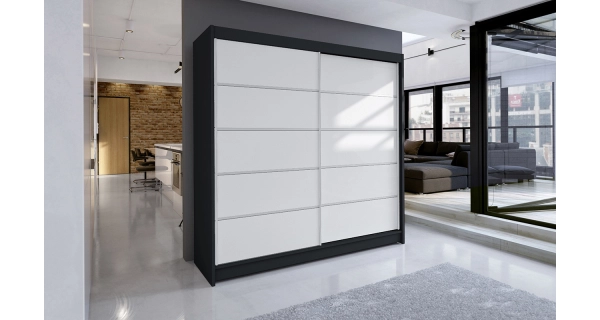 Šatní skříň Barva: černá/bílá Rozměry (šxhxv): 180 x 58 x 215 cm Materiál: - laminovaná deska o tloušťce 16 mm, hrany ABS - hliníkové kolejnice Sevroll - úchyty ve formě hliníkové lišty, která zabrání