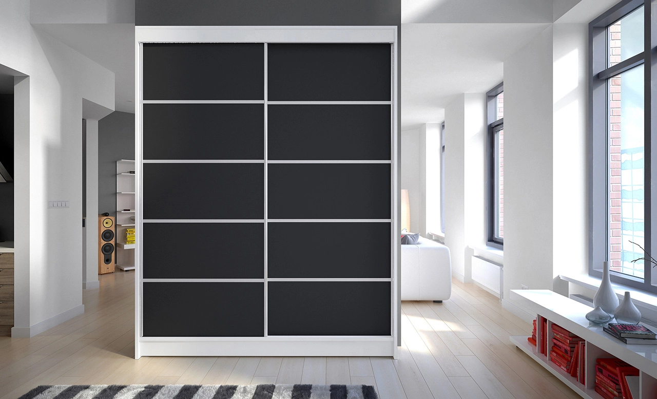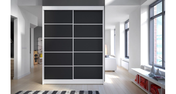 Šatní skříň Barva: bílá/černá Rozměry (šxhxv): 150 x 58 x 200 cm Materiál: - laminovaná deska o tloušťce 16 mm, hrany ABS - hliníkové kolejnice Sevroll - úchyty ve formě hliníkové lišty, která zabrání