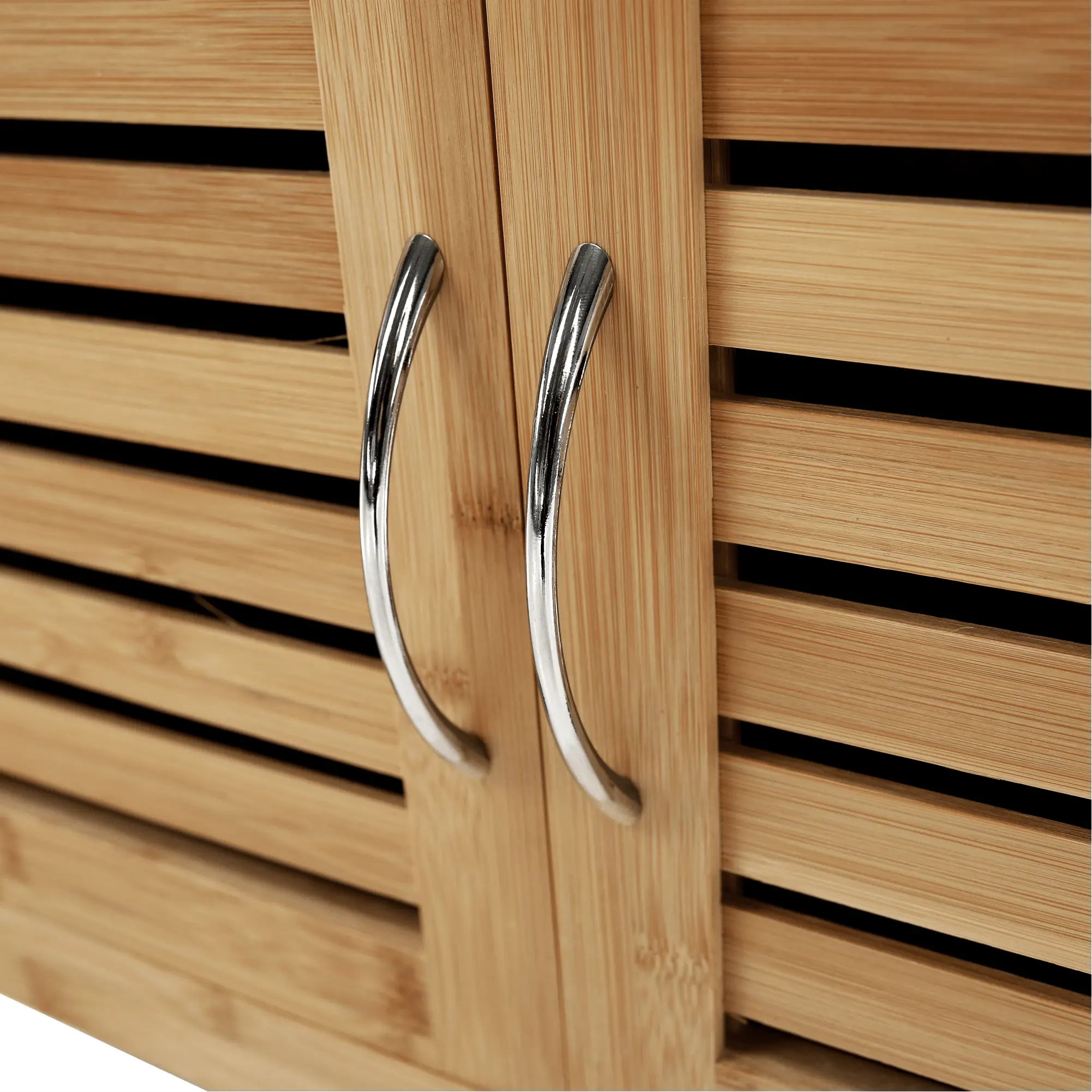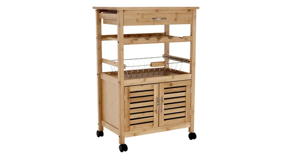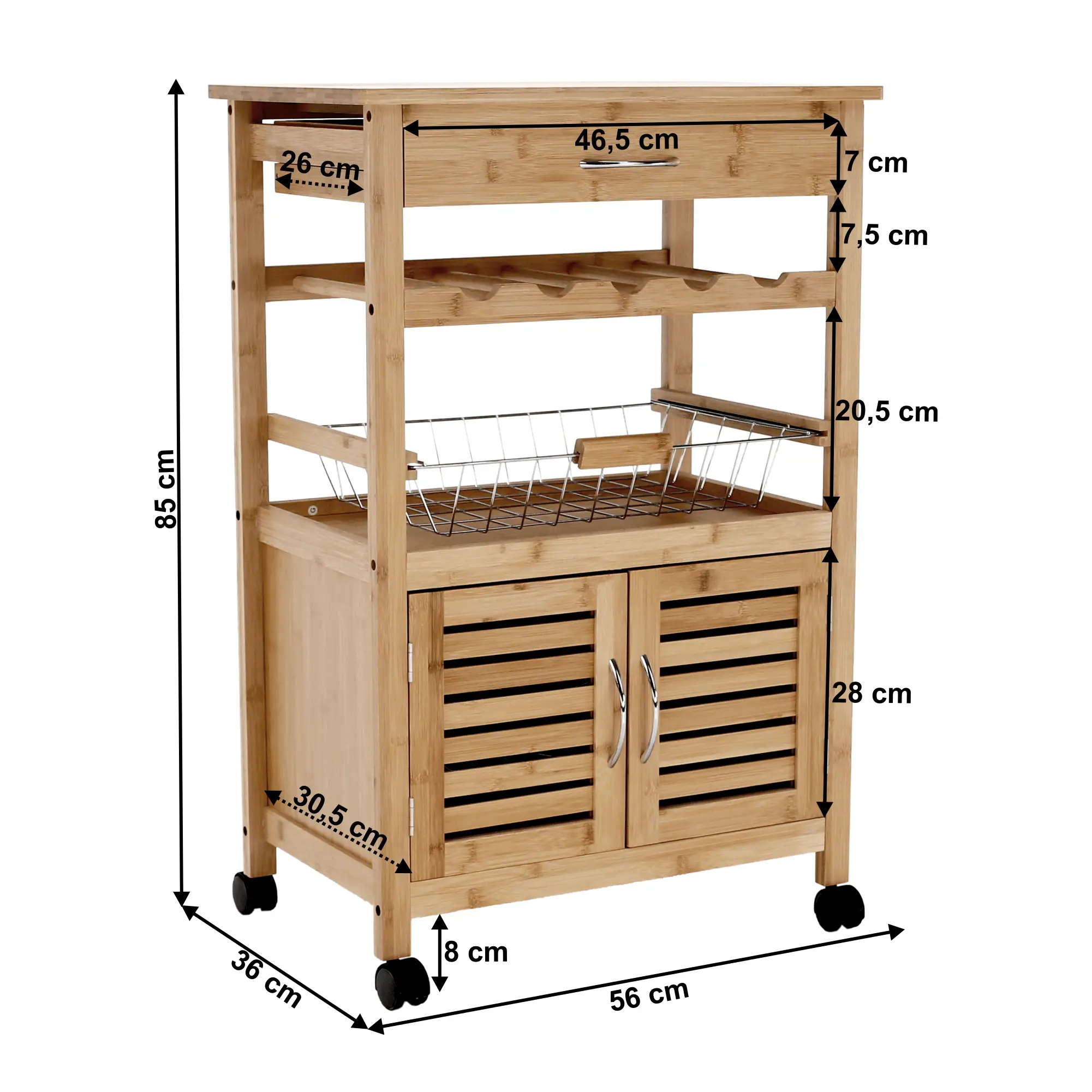 Servírovací vozík Přichází pomocník, který je vždy tam, kde je potřebný dodatečný úložný prostor. Servírovací vozík se prezentuje jako multifunkční pomocník. Hrdě se pyšní jedinečným designem a množstvím odkládacího prostoru. Nabízí místo pro všechno. Disponuje jednou zásuvkou na příbory nebo jiné kuchyňské náčiní. Výsuvný košík vyrobený z kovu je perfektní řešení na uskladnění ovoce a zeleniny. Nad košíkem se nachází laťová police s držákem pro lahve. Ocet, olej, víno či jiné dobroty zde najdou své místo. Ve spodní části se nachází dvoudveřová skříňka, v níž lze dobře uskladnit nádobí nebo zásoby potravin a v případě potřeby jsou k dispozici. Vozík je vyroben z bambusu v jedinečném přírodním provedení, hravě a snadno zapadne do jakéhokoliv interiéru. O rychlý přesun se starají čtyři kolečka, z čehož dvě disponují brzdami, které ho neochvějně drží na zvoleném místě. Přiveze, odveze a uskladní vše, co budete potřebovat. Vaši hosté zůstanou ohromeni tímto jedinečným a šarmantním sluhou.