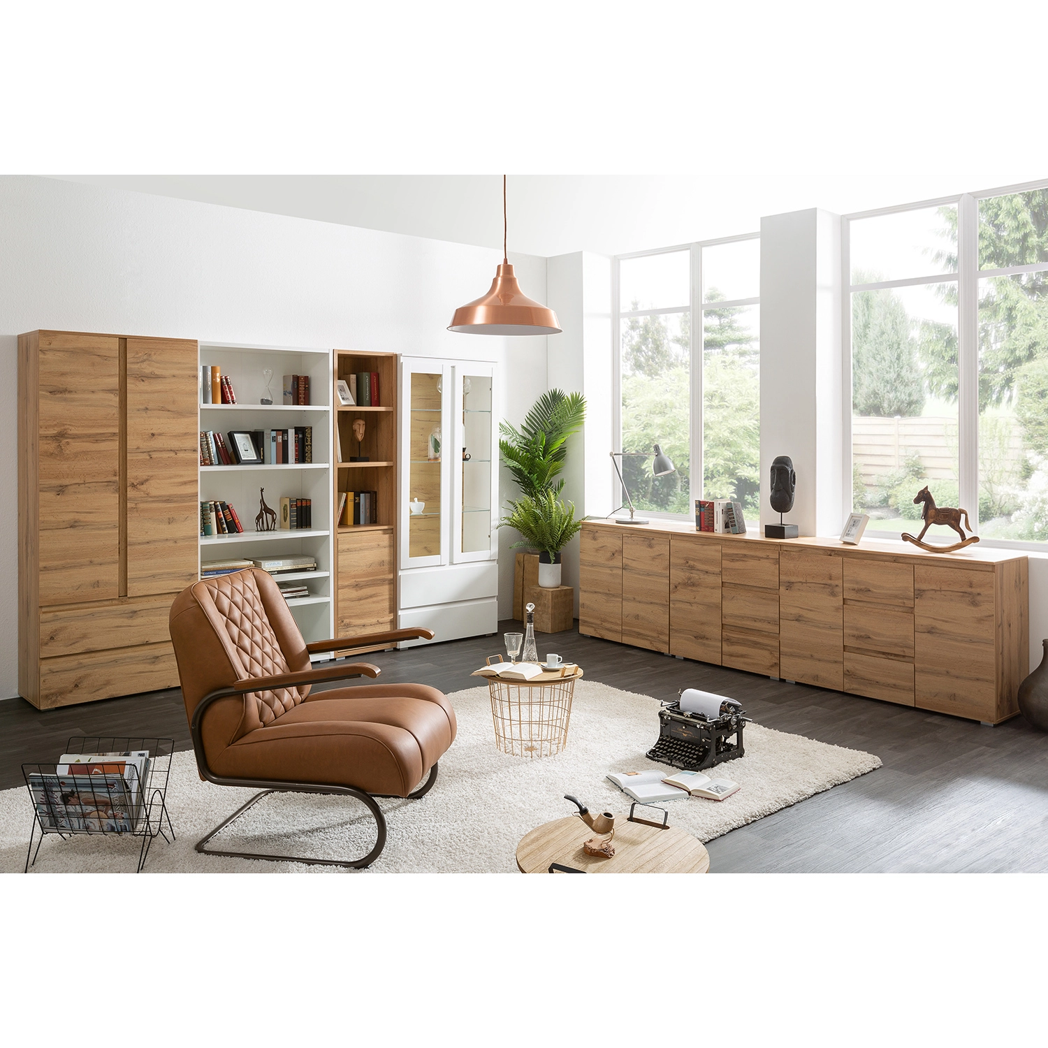Skříň obsahuje tři police a dvě široké zásuvky s kovovými pojezdy.