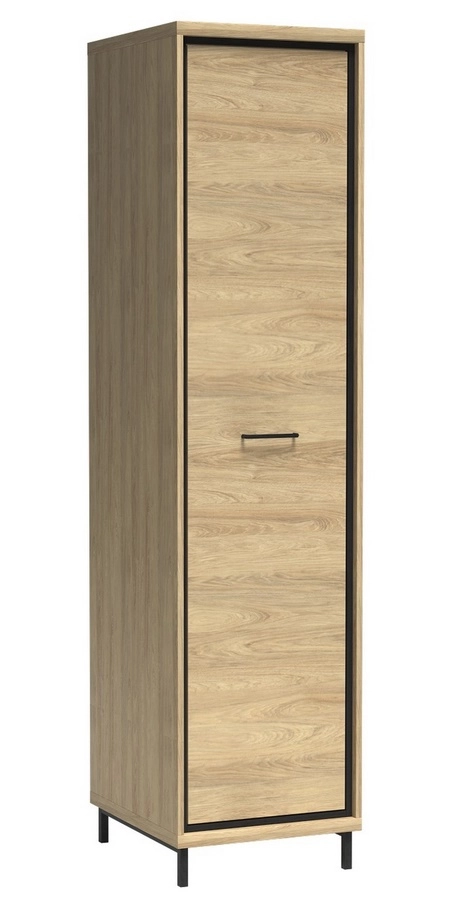Šatní skříň jednodveřová ze sektorové řady doplněna prvky v černé barvě. Nábytek je vybaven systémem tichého dovírání. Uvnitř skříně je šatní tyč a nad ní police. Barva: dub hickory Rozměry (šxvxh): 49,5 x 197 x 58,2 cm Materiál: kvalitní lamino ohraněné ABS páskou Úchyty: kov Dodáváno v demontu.