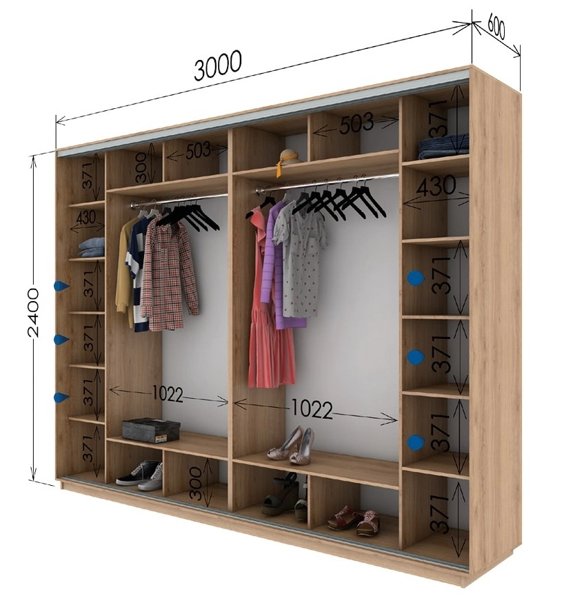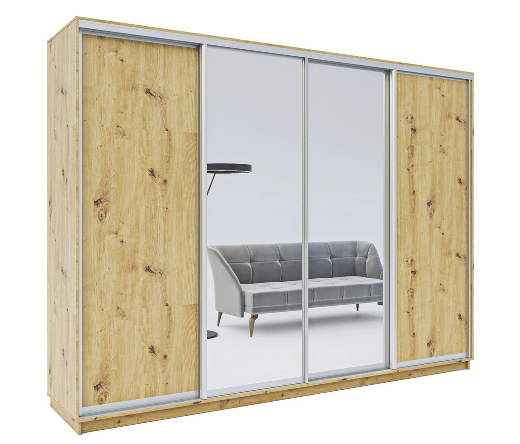 Nezvyklá výška 240 cm a šířka 300 cm Vám nabídne opravdu velký úložný prostor. Korpus i dveře jsou z kvalitní LTD desky v barvě dubu artisan. Skříň má aluminiové kování a lišty, dvoje dveře jsou osazeny zrcadly. Uspořádání polic viz obrázek.