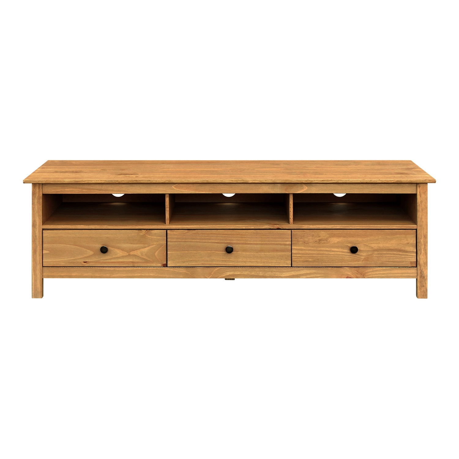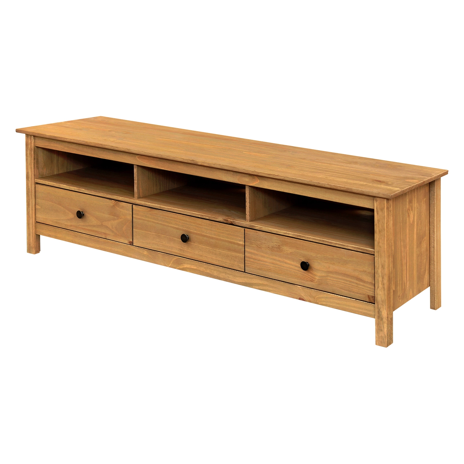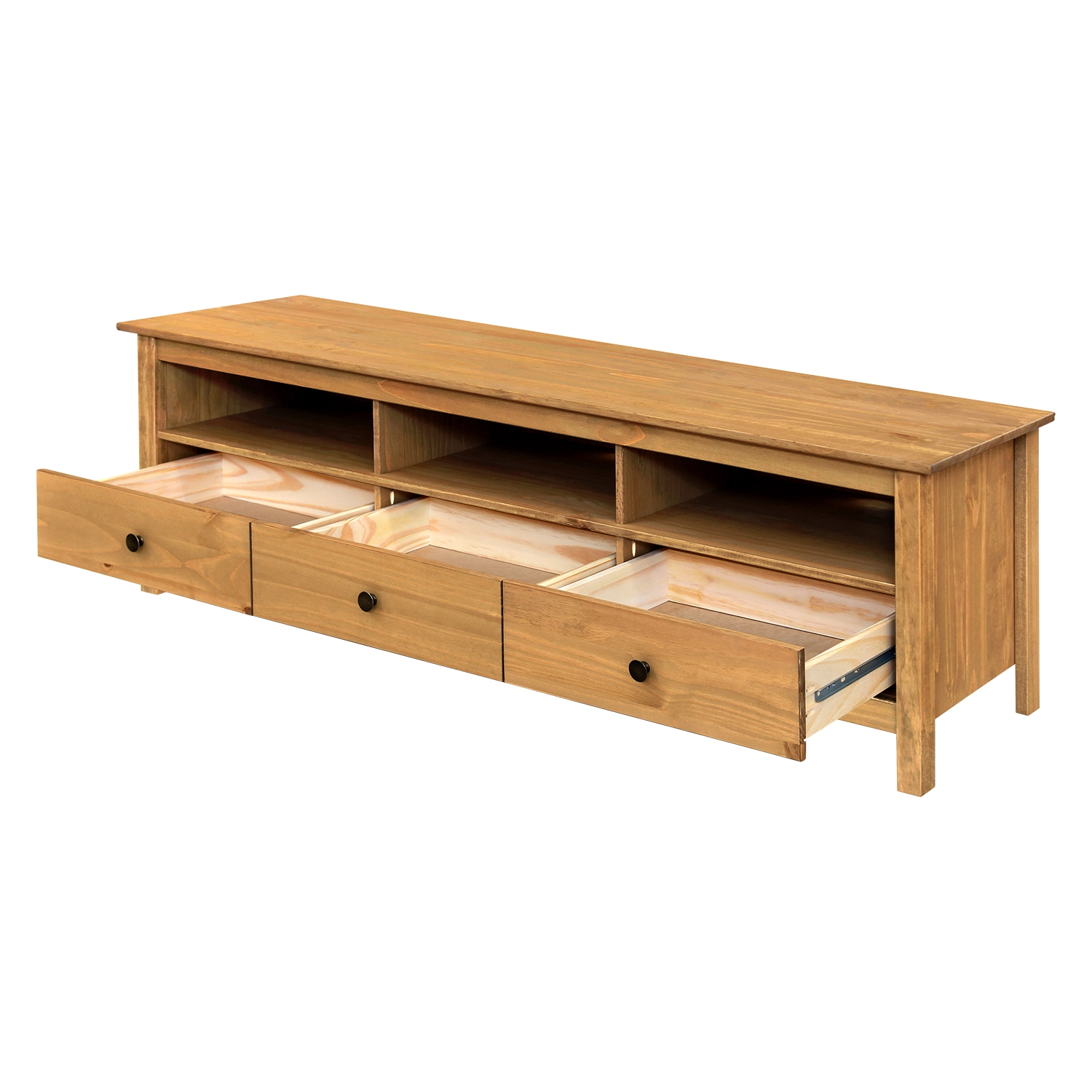 TV stolek z masivu Materiál: borovice masiv - voskované provedení v medovém odstínuBarva: borovice- 3 zásuvky s kovovými pojezdy- kovové úchytky v barevném provedení černěná mosazRozměry (šxhxv): 158 x