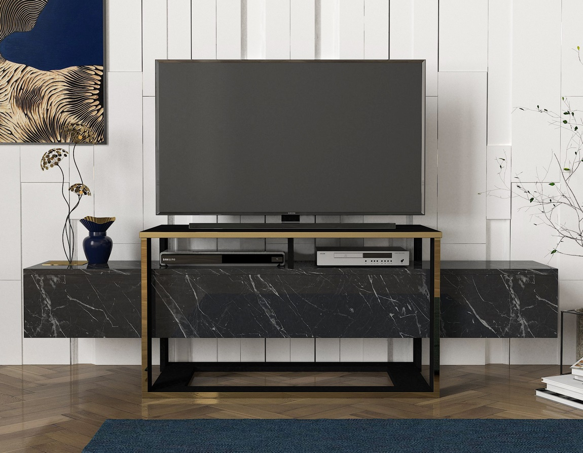 Televizní stolek je vyroben z kvalitního lamina o tl.18 mm hraněné PVC páskou, odolného proti poškrábání v barvě marble. Černá kovová konstrukce je lemovaná zlatou barvou. Na bocích se nachází praktický úložný prostor.