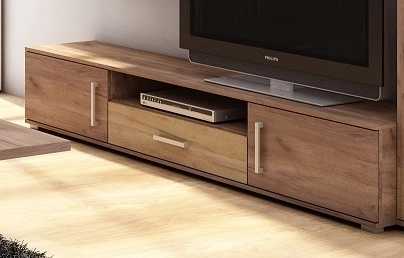 Televizní stolek s dvířky Barva: craft tobaco/craft zlatý Materiál: lamino 16 mm, ABS hrana 0,6 mm Rozměry (šxvxhl): 200 x 36 x 42 cm Madla zásuvek a dvířek jsou vyrobeny z tvrzeného PVC. Dodává