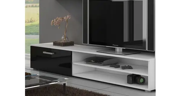 Televizní stolek Barva: bílá/černý lesk Materiál: lamino 16 mm Rozměry (šxvxhl): 190 x 32 x 42 cm Dodává se v demontu.
