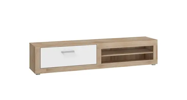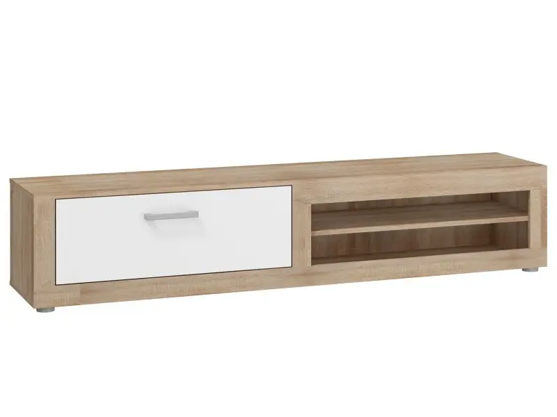 Televizní stolek s dvířky TV stolek má 1 dvířka. Barva: dub sonoma/bílý lesk Materiál: lamino 16 mm Rozměry (šxvxhl): 190 x 39 x 42 cm Dodává se v demontu.