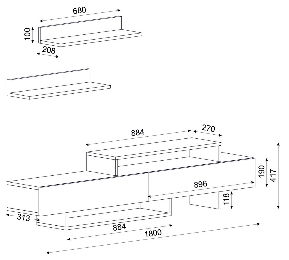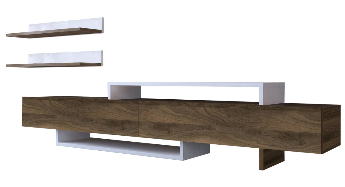 Barva: vlašský ořech/matná bílá Rozměry (šxvxh): - televizní stolek: 180 x 41,7 x 31,3 cm - police: 68 x 10 x 20,8 cm Materiál: LTD (lamino)