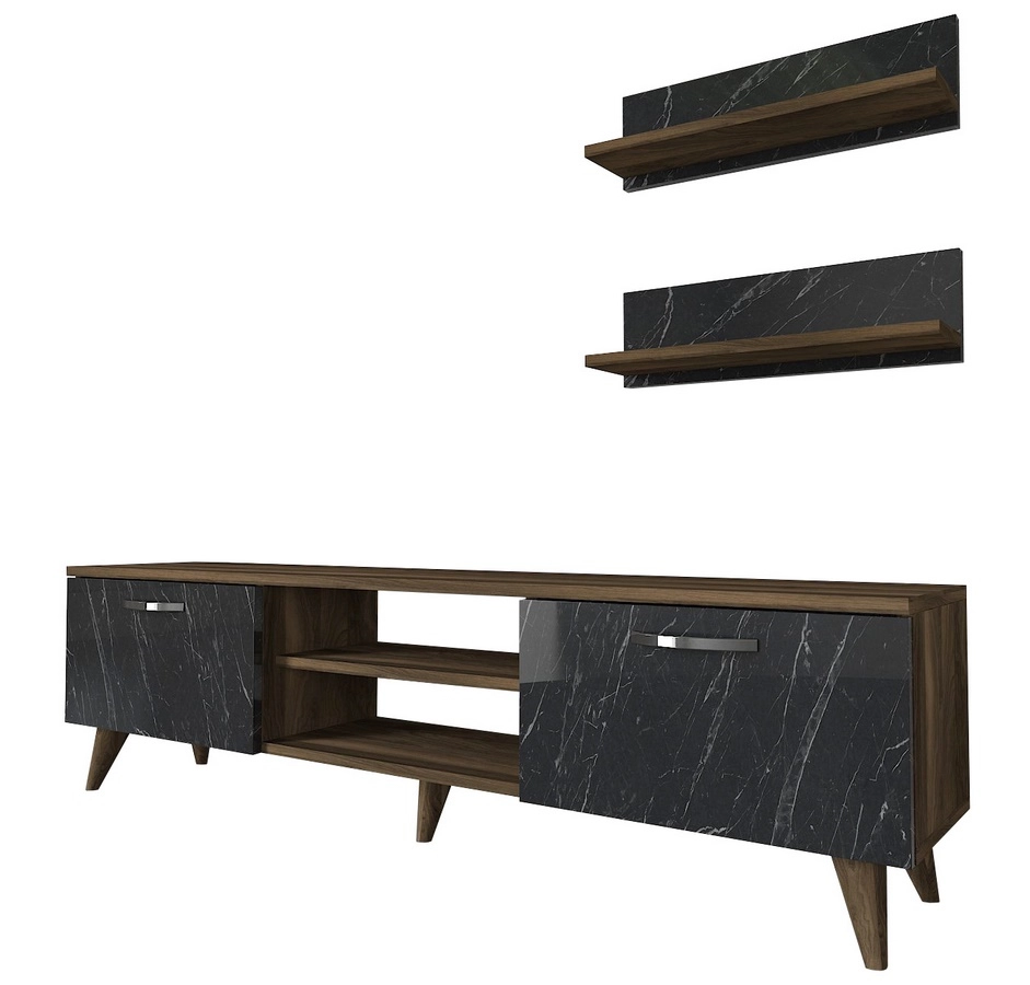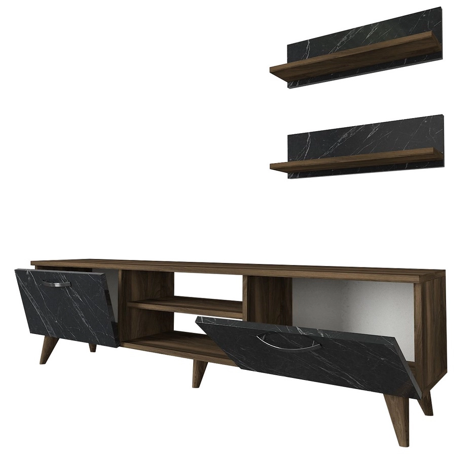 Televizní stolek se dvěma výklopnými dvířky je vyroben z kvalitního lamina o tl.18 mm hraněné PVC páskou, odolného proti poškrábání v kombinaci barev vlašský ořech/bílá.