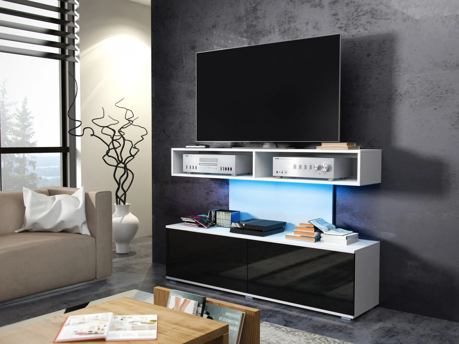 TV stolek Barva: bílá/černý lesk Rozměry (šxvxh): 140 x 94 x 36 cm Materiál: LTD 16 mm LED osvětlení není v ceně. Dodání v demontu.