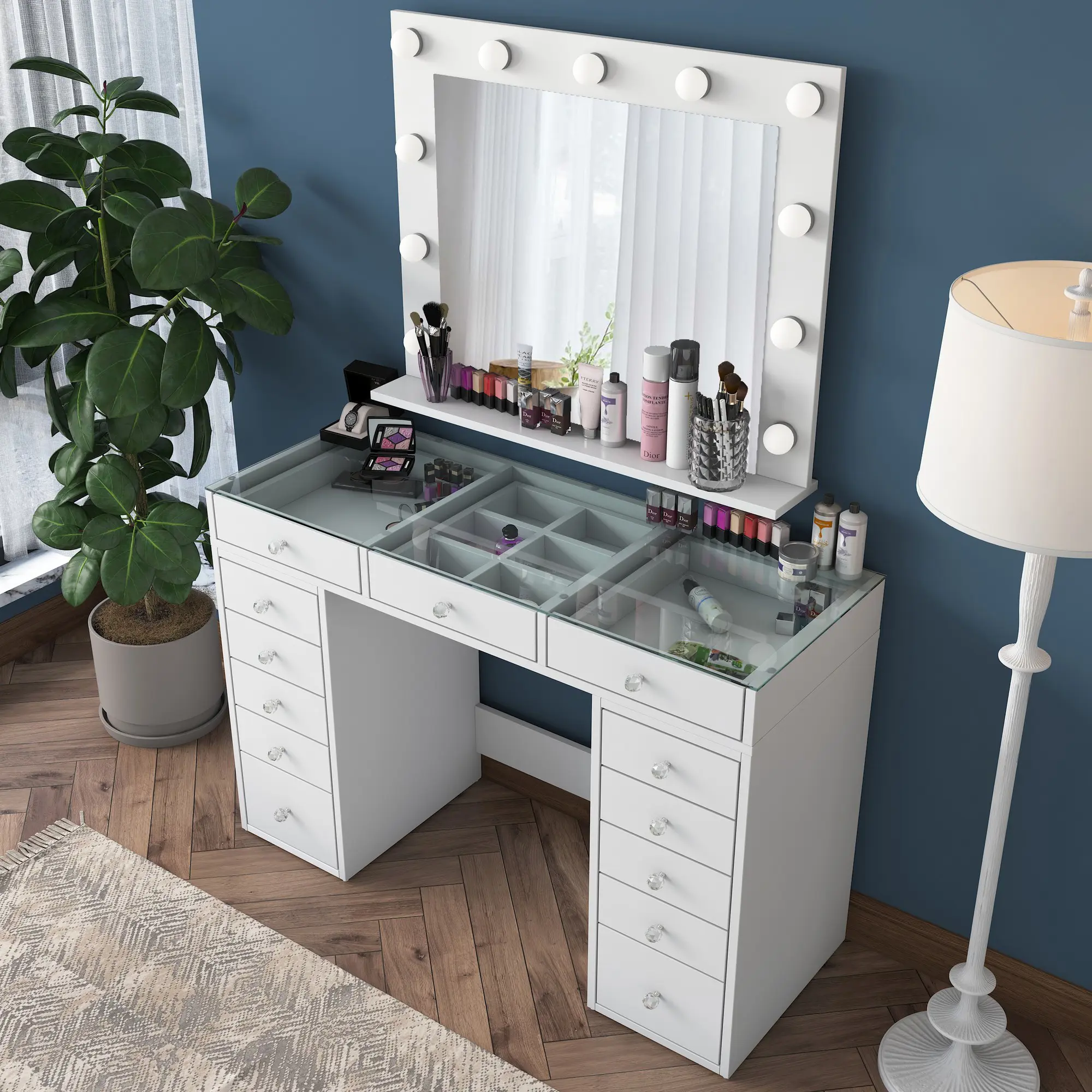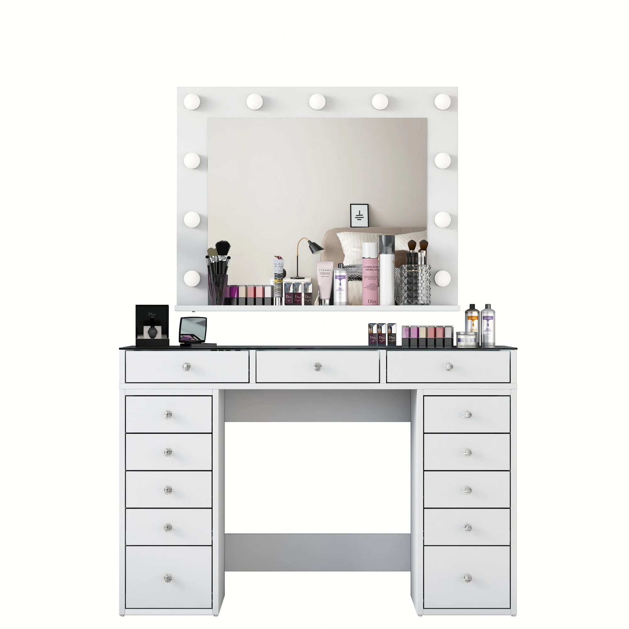 Toaletní stolek Barva: bílá Materiál: melaminem potažená dřevotřísková deska - 18 mm, sklo Rozměry (šířka x výška x hloubka): 120 x 79,8 x 44,5 cm - zrcadlo 90 x 71,8 x 15 cm V ceně 11 žárovek. Dodáváno