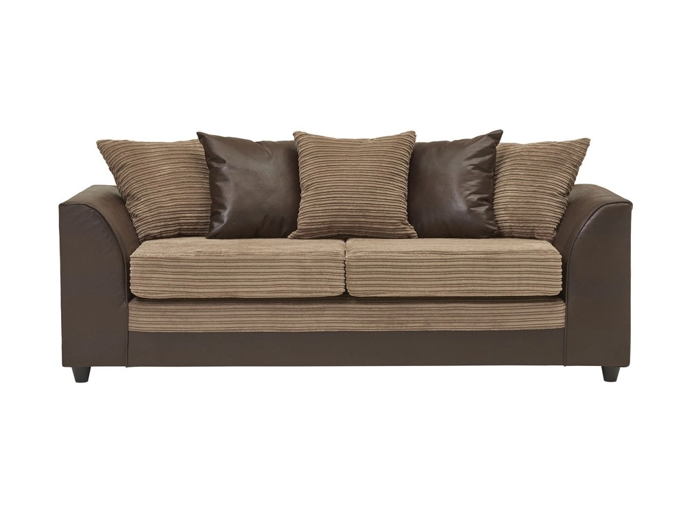 Trojsedák Potahová látka: Jumbo Mocca =béžová látka (struktura manšestru)/Viper Brown = hnědá látka podobná ekokůži Rozměry (šxhxv): 194 x 79 x 63 cm (90 cm s polštáři - podle ustavení) Výška sedu: 43 cm