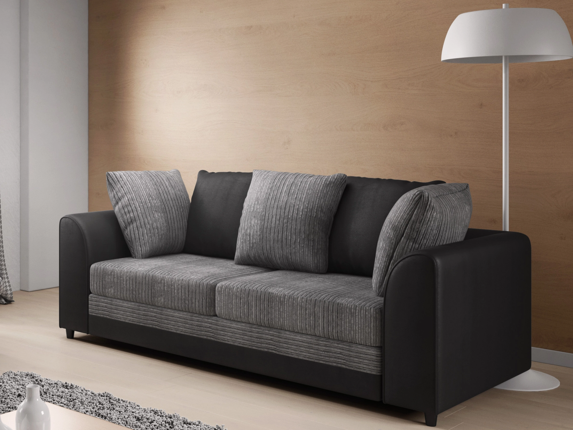Trojsedák Potahová látka: Jumbo Grey = šedá látka (struktura manšestru)/Viper Black = černá látka podobná ekokůži Rozměry (šxhxv): 194 x 79 x 63 cm (90 cm s polštáři - podle ustavení) Výška sedu: 43 cm