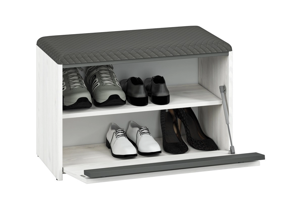 Botník s výklopnými dvířky a polstrovaným sedákem. Rozměr (šxvxh): 70 x 47 x 34 cm Barva: borovice sněžná/antracit Materiál: LTD (lamino) Dodáváno v demontu.