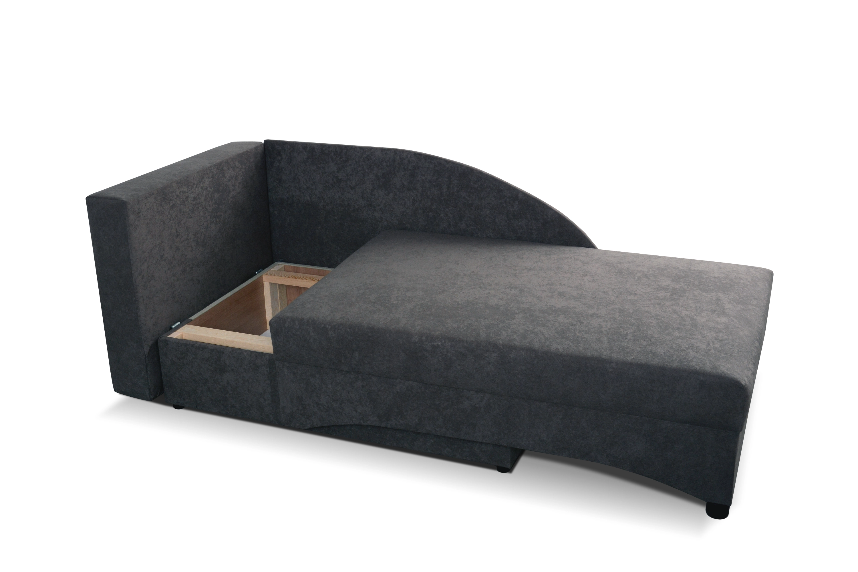 Válenda Provedení levé. Potahová látka: Suedine 36 = šedá látka / polštář = látka Grafity 1 Materiál: pružiny bonell, polyuretanová pěna T25 Rozměry (dxšxv): 150 x 85 x 70 cm Výška sedu: 42 cm Hloubka sedu: 80/134 cm Prostor pro spaní: 198 x 80 cm Rozměry úložného prostoru: 112 x 72 cm Nohy plastové. Záruka 24 měsíců.