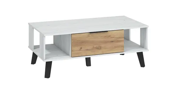 Velký konferenční stolek s výklopnými dvířky, z každé strany jedny Barva: - craft bílý/craft zlatý - úchyty a nožky: černá Rozměr (šxvxh): 120 x 46 x 69 cm Výška nožek: 18 cm Materiál: - lamino