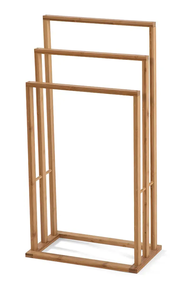 Moderní stojanový věšák na ručníky s praktickým designem. Tři samostatné tyče pro přehledné zavěšení více ručníků. Stabilní konstrukce zajišťuje pevnost a odolnost. Ideální doplněk do koupelny či wellness