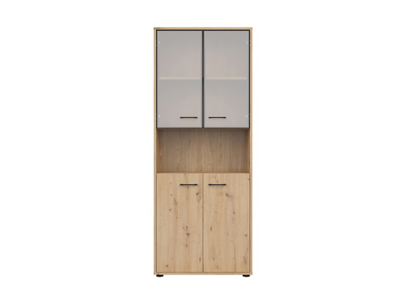 Vitrína - je částečně prosklená a uzavřená - dvířka mají systém tichého dovírání a černé, tenké úchyty pro snadnější manipulaci při otevírání - úložný prostor je v podobě polic uschovaných za dvířky Výhoda - prosklené dvířka je možné umístit ve vrchní i spodní části. Materiál: lamino/mléčné sklo v hliníkovém rámu Barva: dub artisan/černý mat Rozměry (šxvxh): 80 x 202,5 x 37,5 cm