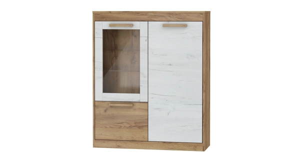 Policová vitrína s dvířky Barva: craft zlatý/craft bílý Rozměr (šxvxh): 100 x 121 x 36 cm Materiál: LTD, ABS hrany, sklo Tiché zavírání. Dodáváno v demontu.