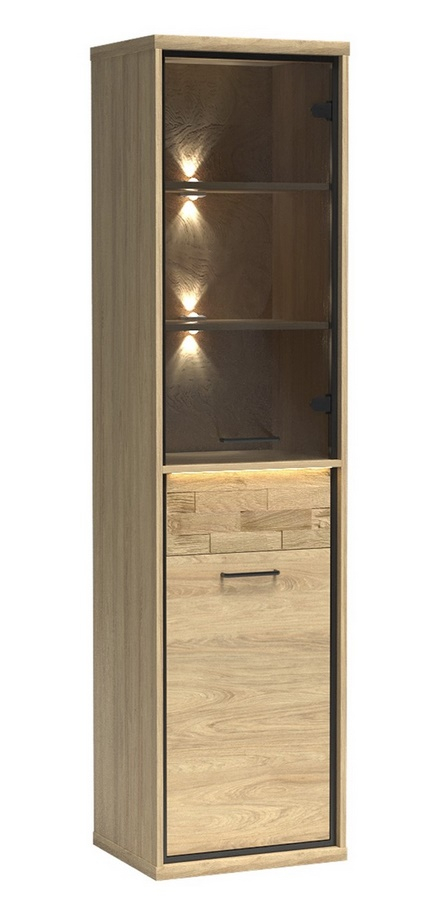 Vitrína dvoudveřová se zásuvkou ze sektorové řady doplněna prvky v černé barvě. Zásuvka je doplněna dekorační dubovou deskou a systémem push to open - otvírání zmáčknutím zásuvky. LED osvětlení není v ceně. Barva: dub hickory Rozměry (šxvxh): 49,2 x 197 x 41 cm Materiál: kvalitní lamino ohraněné ABS páskou/sklo Úchyty: kov Dvířka jsou univerzální, montáž je možná na pravou nebo levou stranu. Dodáváno v demontu.