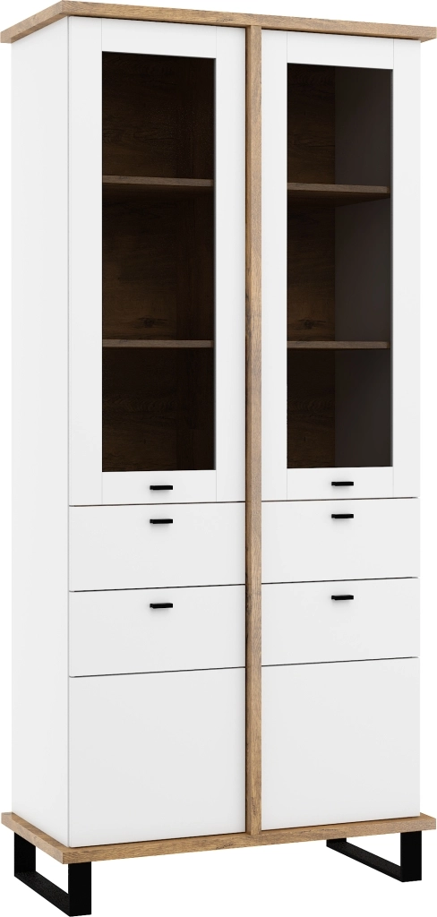 Vitrína ze sektorové řady Vitrína disponuje 2 zásuvkami, 2 skříňkami s plnými dvířky a 2 skříňkami s prosklenými dvířky. Uvnitř skříněk je celkem 6 polic. Skříňky i zásuvky jsou vybaveny systémem tichého dovírání. Vitríny mají kouřová skla. Rozměry (šxvxh): 90 x 195 x 45 cm Barva: dub burgundský/bílá Materiál: lamino tloušťky 16 a 25 mm s ABS hranami Materiál nožek: černý kov - výška 12 cm Úchyty: černá barva Dodáváno v demontu