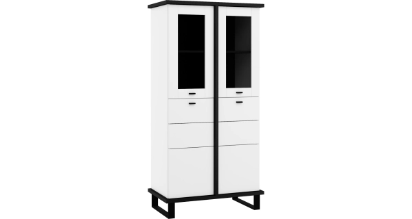 Vitrína ze sektorové řady Vitrína disponuje 2 skříňkami s plnými dvířky a 2 skříňkami s prosklenými dvířky. Uvnitř skříněk je celkem 6 polic. Skříňky i zásuvky jsou vybaveny systémem tichého dovírání. Vitríny mají kouřová skla. Rozměry (šxvxh): 80 x 160 x 45 cm Barva: černá/bílá Materiál: lamino tloušťky 16 a 25 mm s ABS hranami Materiál nožek: černý kov - výška 12 cm Úchyty: černá barva Dodáváno v demontu